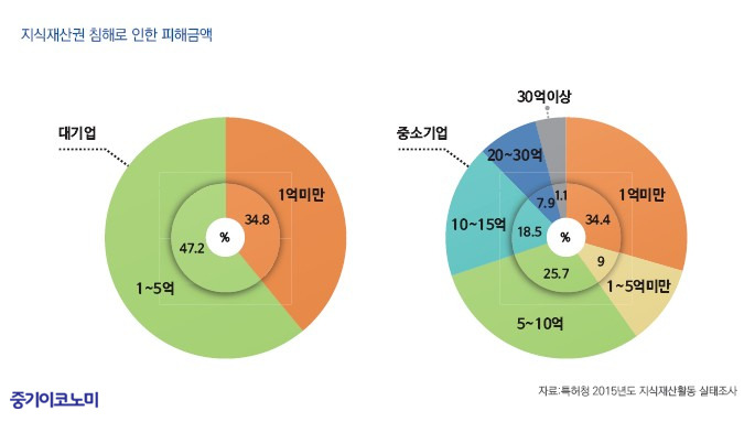 기술유출로 인한 지식재산권 피해는 중소기업에 더 치명적이다. 특허청이 국내 2만5000여 기업을 대상으로 실시한 지식재산활동 실태조사에 따르면 2014년에 1건 이상 지식재산권 침해를 받은 경험이 있는 대기업은3.4%, 중소기업은 6.6%였다. 피해금액도 중소기업이 컸다. 대기업의 지식재산권 침해 피해금액은 5억원을 넘은 사례가 없었다. 반면 중소기업은 5~15억원이라는 응답이 44.2%, 20억원 이상이라는 응답도 9% 있었다.