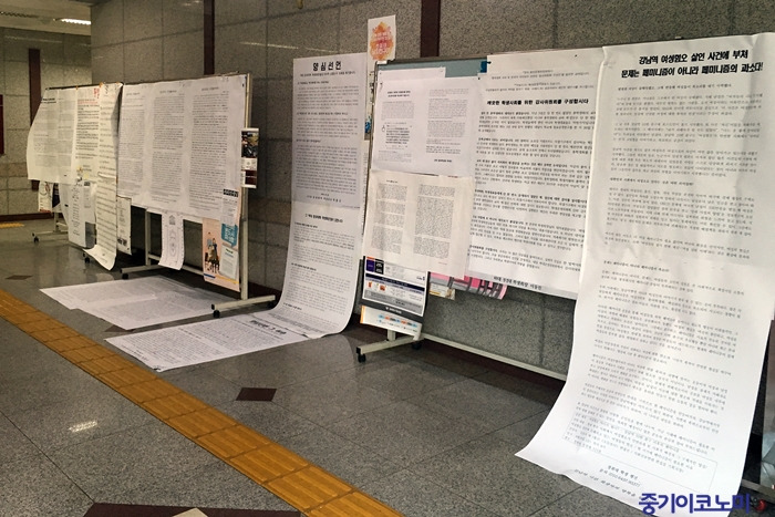 ‘강남역 여성혐오 살인사건에 부쳐’, ‘남북통일은 참사랑으로’…. 경희대 후마니타스 칼리지가 있는 청운관 1층 로비에 붙어있던 대자보 제목이다. 대학을 졸업한 뒤 실로 오랜만에 보는 대자보였다. 전지를 손글씨로 채운 대자보에는 화자(話者)의 목소리가 생생히 담겨있었다. 의외였다. 요즘 대학생들은 취업이나 공무원시험 준비에 매몰돼 있다는 편견을 갖고 있었던 탓이다.