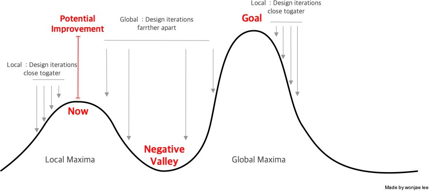 봉우리(목표)에 올라갈수록 최적화 과정이 촘촘해진다. 더 올라갈 수 없을 때 글로벌한 변화를 통해 더 높은 봉우리(목표)로 나아가야 한다*위 그래프는 내가 다양한 아티클에서 발췌한 내용을 토대로 조합해 본건데, 다음 포스팅에서는 해당 그래프에 대한 좀 더 자세한 설명을 해보려고 한다. -> 부정의 골짜기를 지나 Global Maxima를 향해 참조