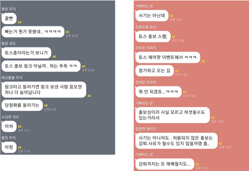 인터넷에 토스충이라는 신조어가 생겼다..어느 날 맛집을 공유하는 카카오톡 채팅방에 토스 광고하나 가 올라왔다. 무심결에 지나칠 법도 한데 대부분의 사람들은 토스 광고가 올라올 때마다 토스충이라느니 광고쟁이라느니 입에 육두문자를 쓰면서 그 사람을 신고하기 시작했고 토스 광고는 방장에 의해 금방 삭제되었다. 이를 통해 우리는 두 가지를 추측해 볼 수 있다.