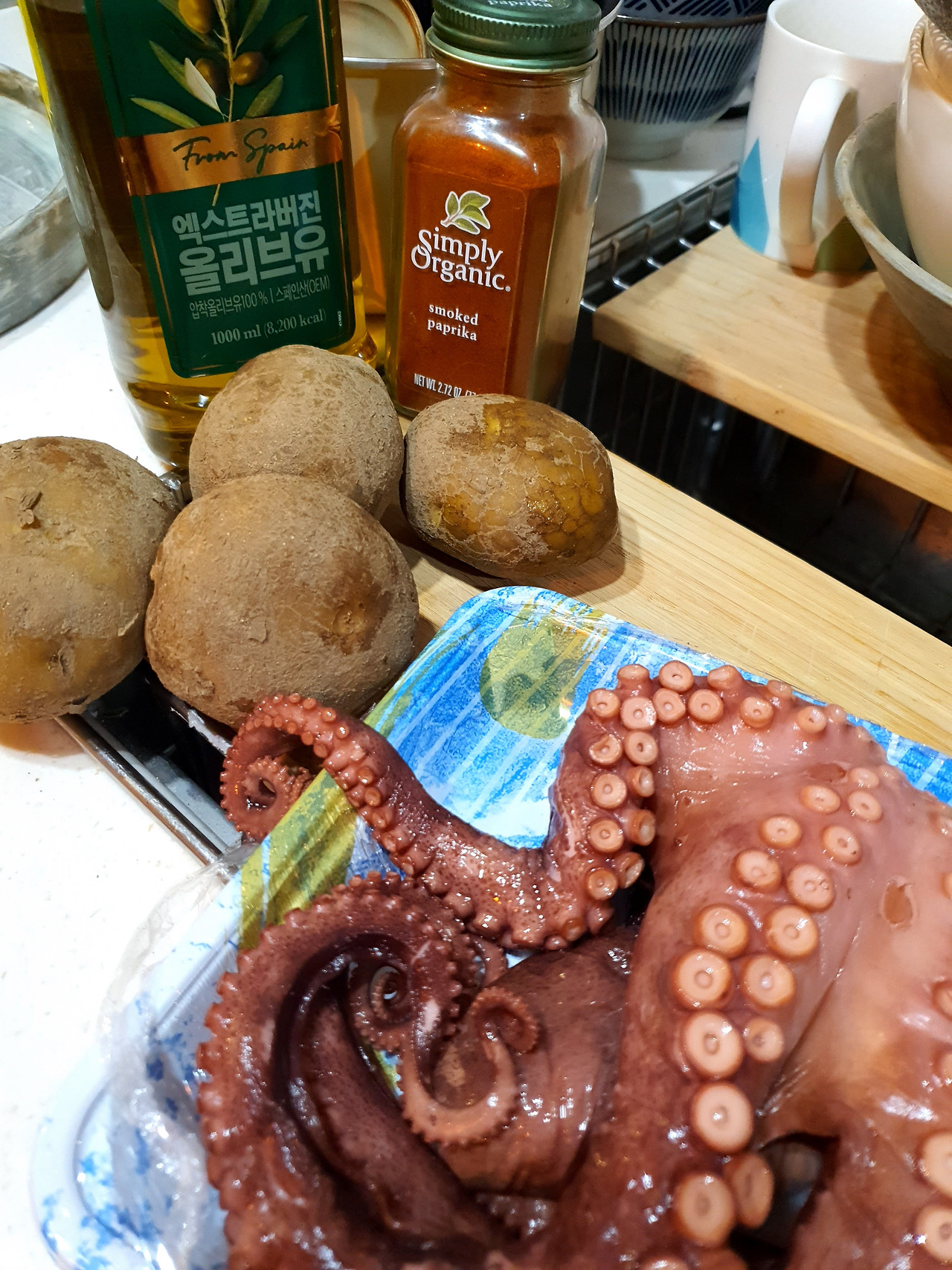 재료 : 문어 반마리, 월계수 잎 두 장, 통후추 약간, 감자 4알, 소금, 훈제 파프리카 파우더, 엑스트라 버진 올리브 오일