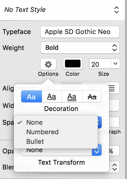 2) 텍스트 가이드의 경우 텍스트 numbering기능이나 bullet기능을 이용할 수 있다. 다만 긴 텍스트의 경우 bullet기능을 적용하면 끝 문장에만 적용하고 싶어도 전체 텍스트에 bullet기능이 적용되기 때문에 다시 수정해야 해서 번거롭다.. 텍스트 가이드를 일단 다 작성한 이후 마지막에 bullet을 적용해서 정리하는 게 그나마 두 번 일을 하지 않는 방법이다.