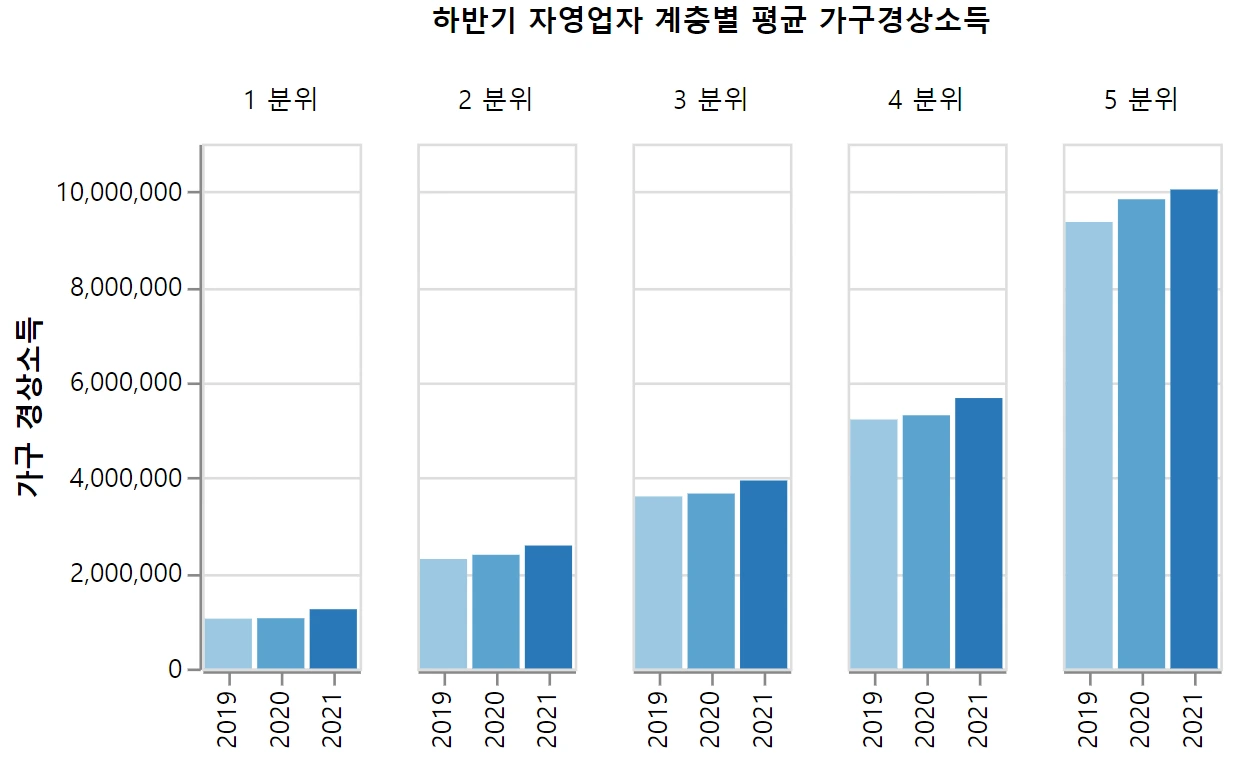 자영업자 소득을 하반기 월평균 가구경상소득 기준으로 비교했을 때, 2019년보다 2020년이, 2020년보다 2021년 소득이 더 높다. 다만 계층간 격차는 더욱 커지고 있다.