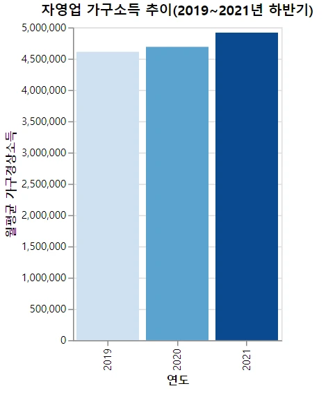 분석 결과가 뜻밖이었다. 자영업자의 전체 월평균 가구소득은 2019년 460만원 대에서 2021년 490만원 대까지 계속 올랐다.