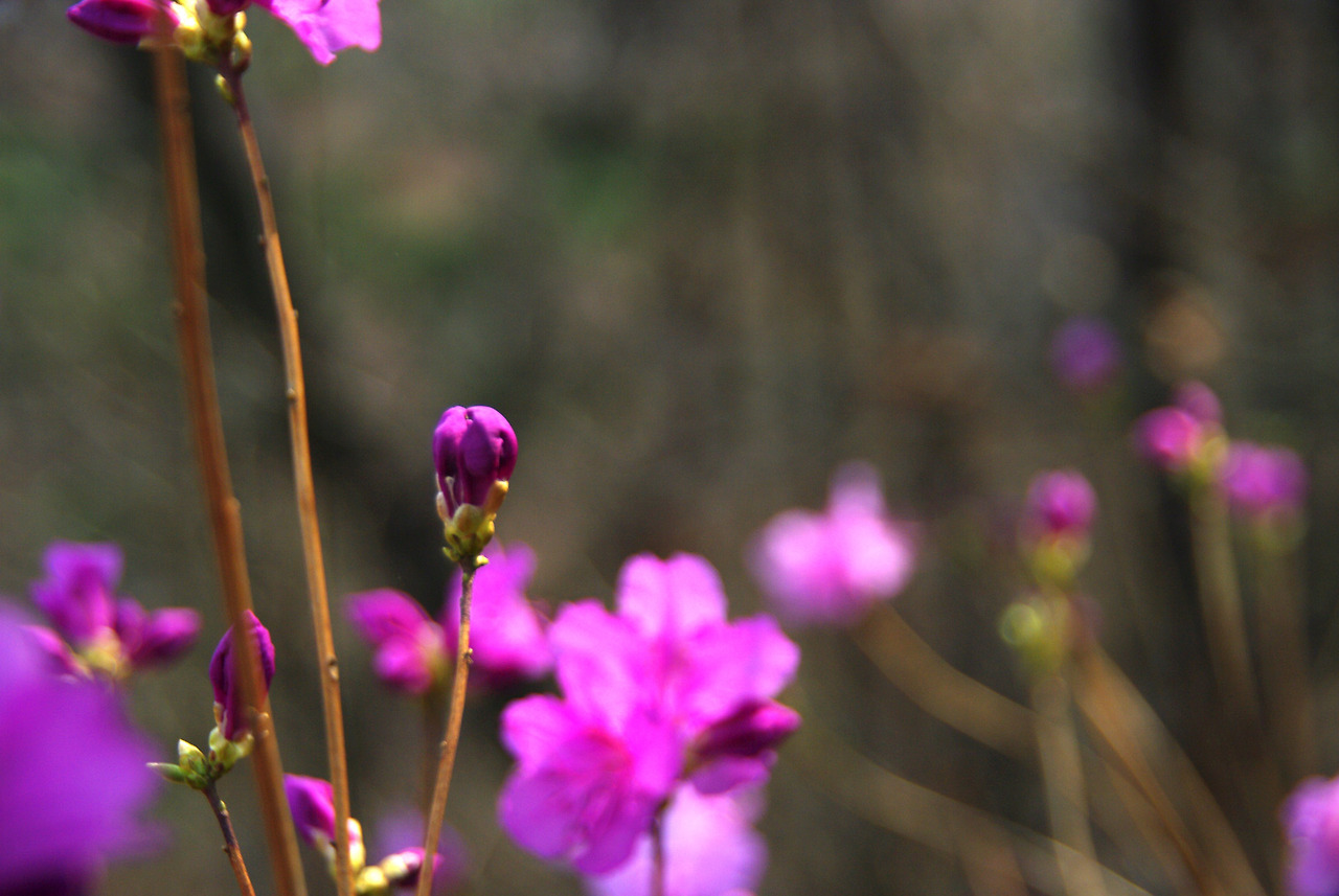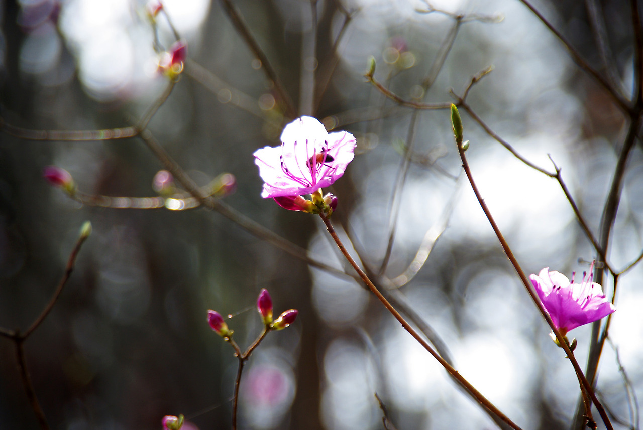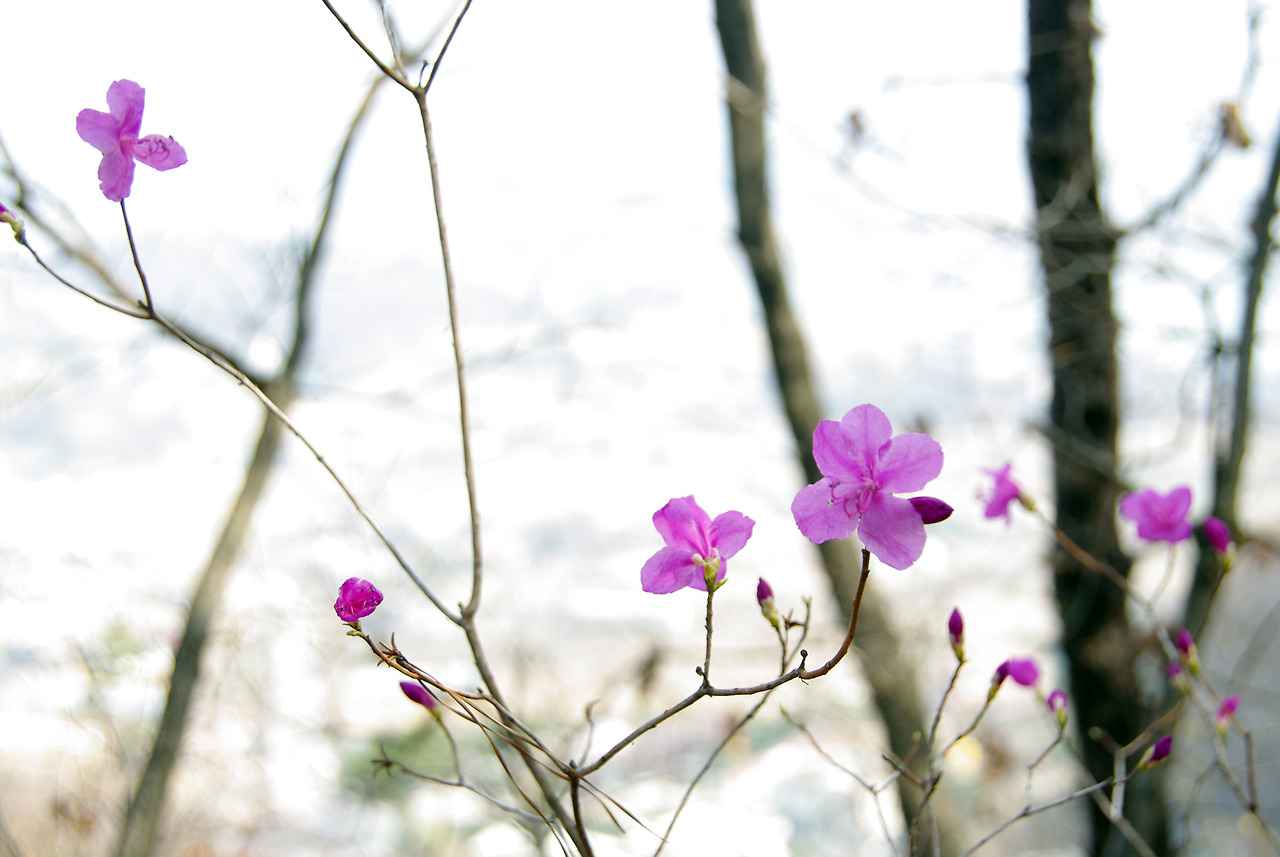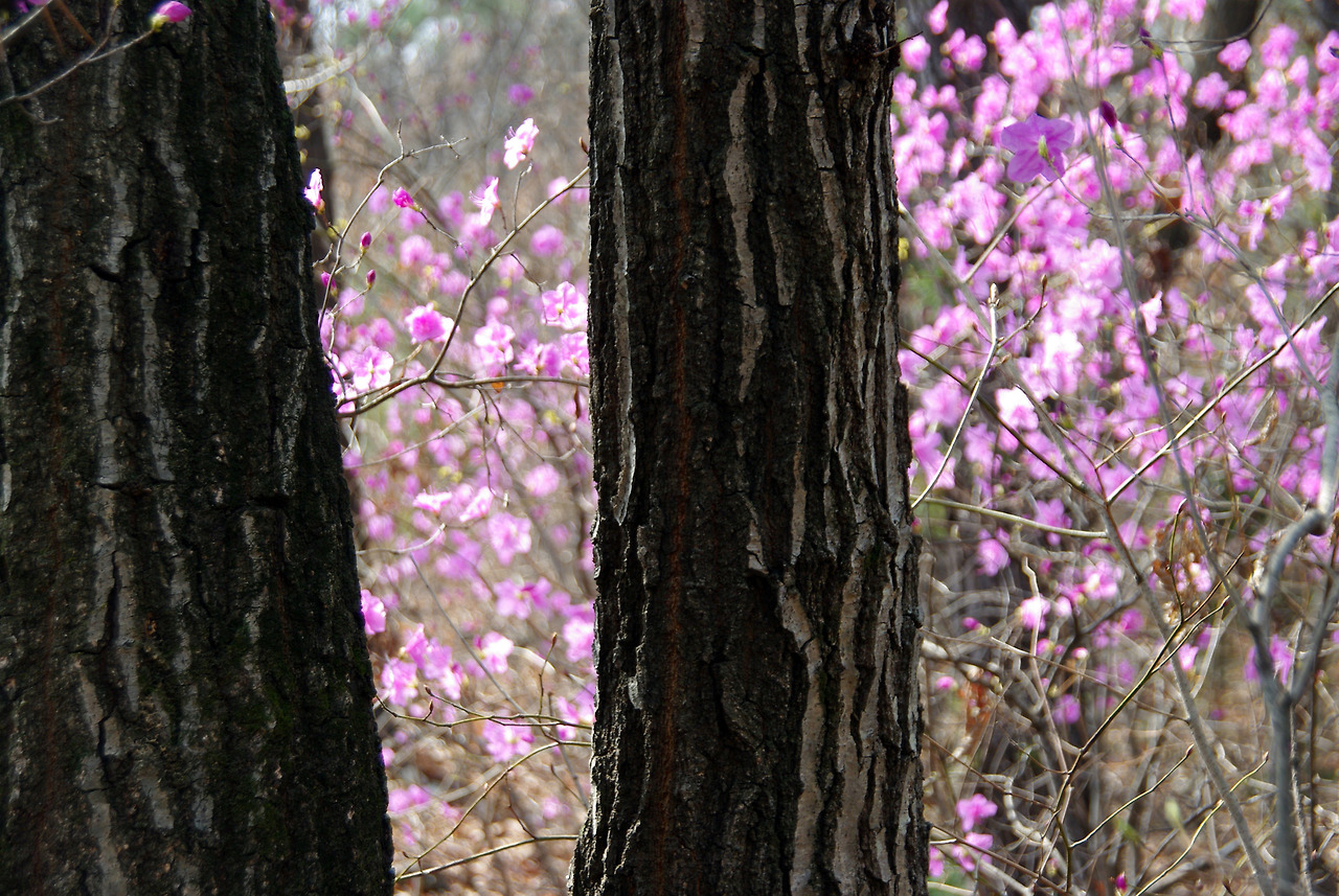 남녀노소를 불문하고 세상에 이토록 마음을 설레게 하는 연분홍 빛깔이 또 있을까? 아직은 새잎이 돋지 않은 무채색의 숲에서 참꽃만이 연분홍으로 수줍게 볼을 붉히고 겨우내 꺼져 있던 감성의 스위치를 올려놓는다. 숲에서는 어느 것도 색을 밝히지 않아서 붉은 계열의 색조로 홀로 도드라질 만도 하지만 가까이 있어도 어느 정도 거리에 있는 듯, 숨바꼭질이라도 하는 듯 아른아른하다. 그래서 더 곱다.