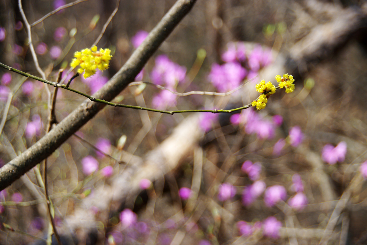 초봄의 산자락에는 이렇게 튀밥이 터지는 듯한 노란 산수유 꽃도 함께 만날 수 있다. 앞서거니 뒤서거니 하면서 서로의 자태를 뽐내지만 사이좋은 오누이룰 보는 듯하여 산행길을 흐뭇하게 만들어 준다.