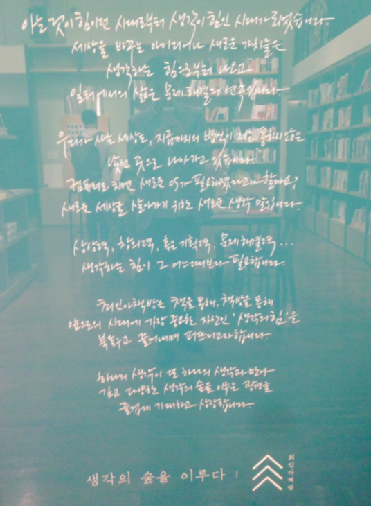 이 글귀는 "아는 것이 힘인 시대로부터 생각이 힘인 시대가 됐습니다."
