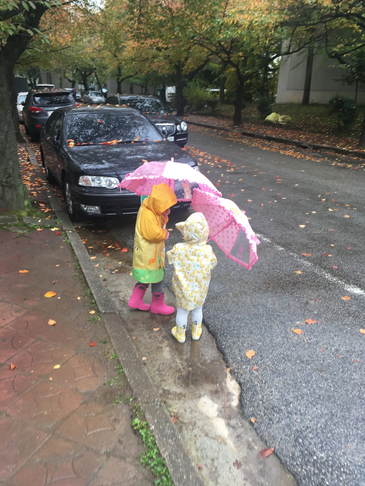 우산 들고 웅덩이 팍팍 걷어차기 좋아하는 딸.