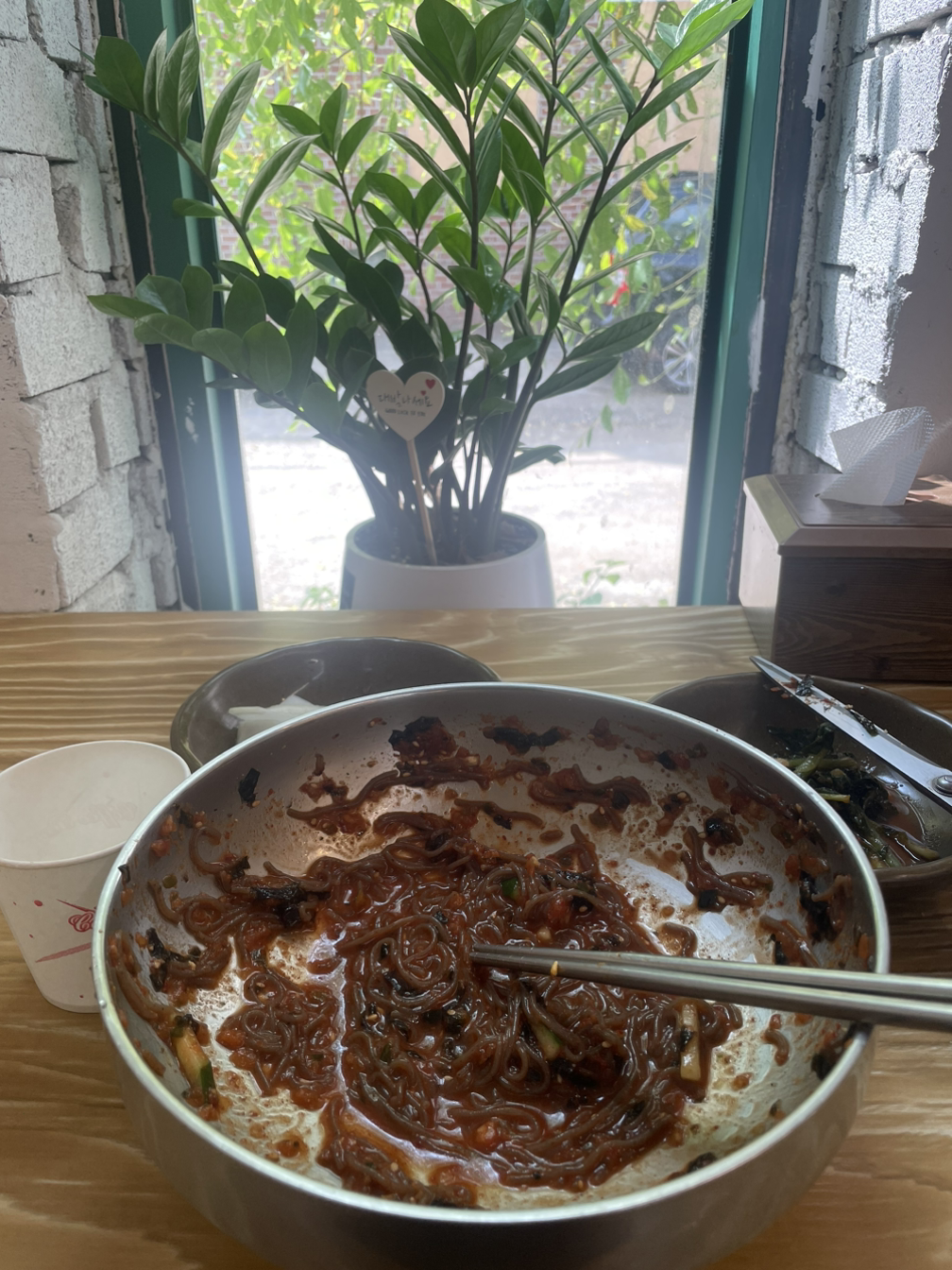 비빔막국수를 시켜놓고는 그렇게나 행복했다. 그리고 비빔막국수 등장. 한입을 뜨기 전의 행복이란, 모든 것이 지금 완전한 때의 그 기분이란 아무나 잘 모를걸. 후루룩. 면발이 조금 풀어진것 빼고는 완벽한 맛이다. 세지 않고 슴슴하다. 과연 맛집이로구나. 내가 평소에 빨리 밥을 먹는 편은 아닌데, 어머. 조금 지나니 거의 다먹었다. 분명 양이 많은 집이라고 들었는데. 내가 평소에 양이 많은 편은 아닌데.... 흠. 아닌가. 모르겠다. 맛나게 먹고 하남페이로 결제하니 더 기분좋아. 아주 배가 불러서는 바로 옆에 있는 카페로 들어와 카페라떼에 마들렌 하나 시켜놓고는 또 나오자마자 우걱우걱 먹는다. 음.. 이맛이구나 맛난다 맛나.