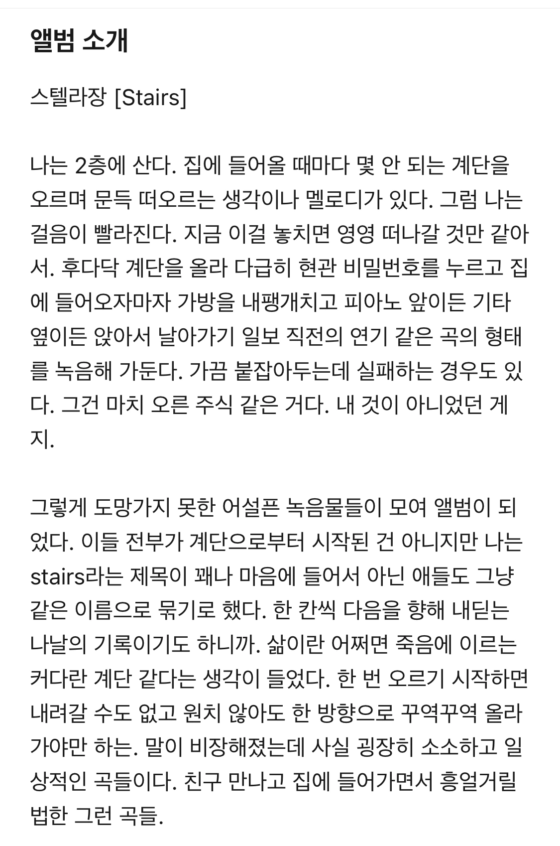 스텔라장의 앨범 소개글. 아니 저기.. 음. 내가 당신의 문체에 반한것은, 아마도 나의 문체와 거진 유사하기 때문이리라..라고 말해도 되려나. 신기할만큼, 어디서 많이 본듯한 문장들.