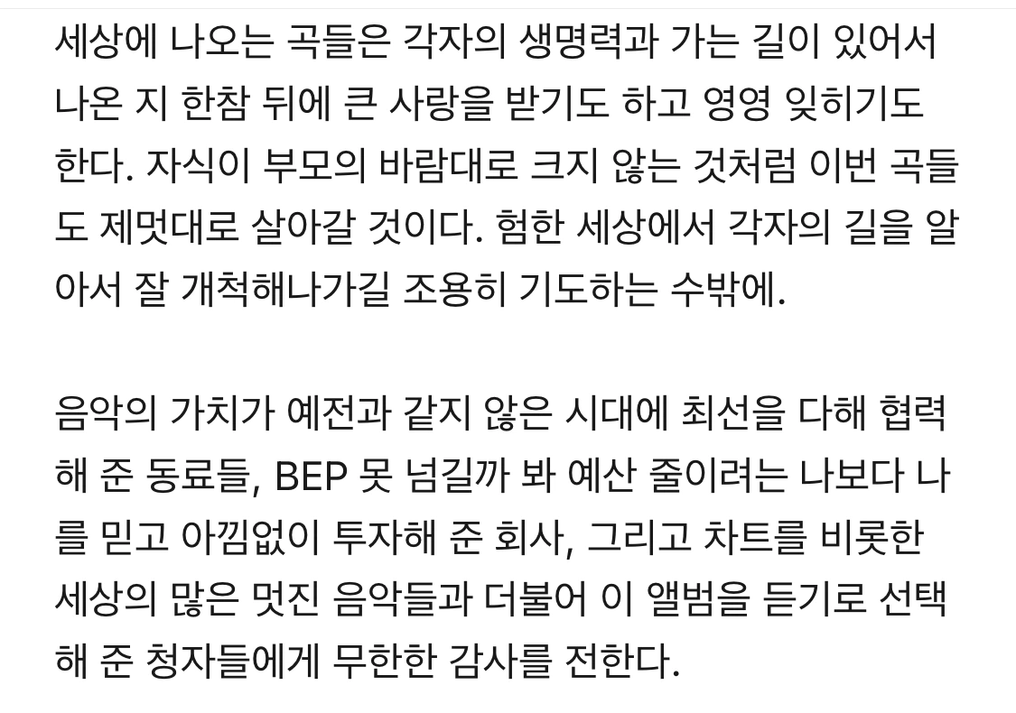 본인의 곡을 의인화한것 또한 매력적. "험한 세상에서 각자의 길을 알아서 잘 개척해나가길 조용히 기도하는 수밖에." 그리고 청자들에게 감사를 전하는 따스한 마음을 뭉근히 전한채 앨범 소개 마무리.