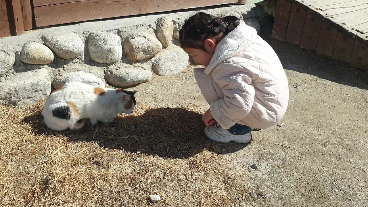 도심에서는 이렇게 고양이를 자세히 볼 수 없는 아이는 고양이가 너무 예뻐서 어쩔 줄 몰라하며 그 앞에서 고양이를 구경했다.