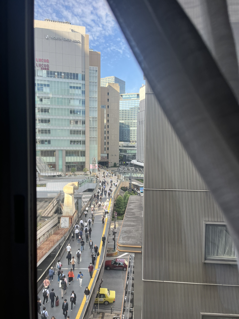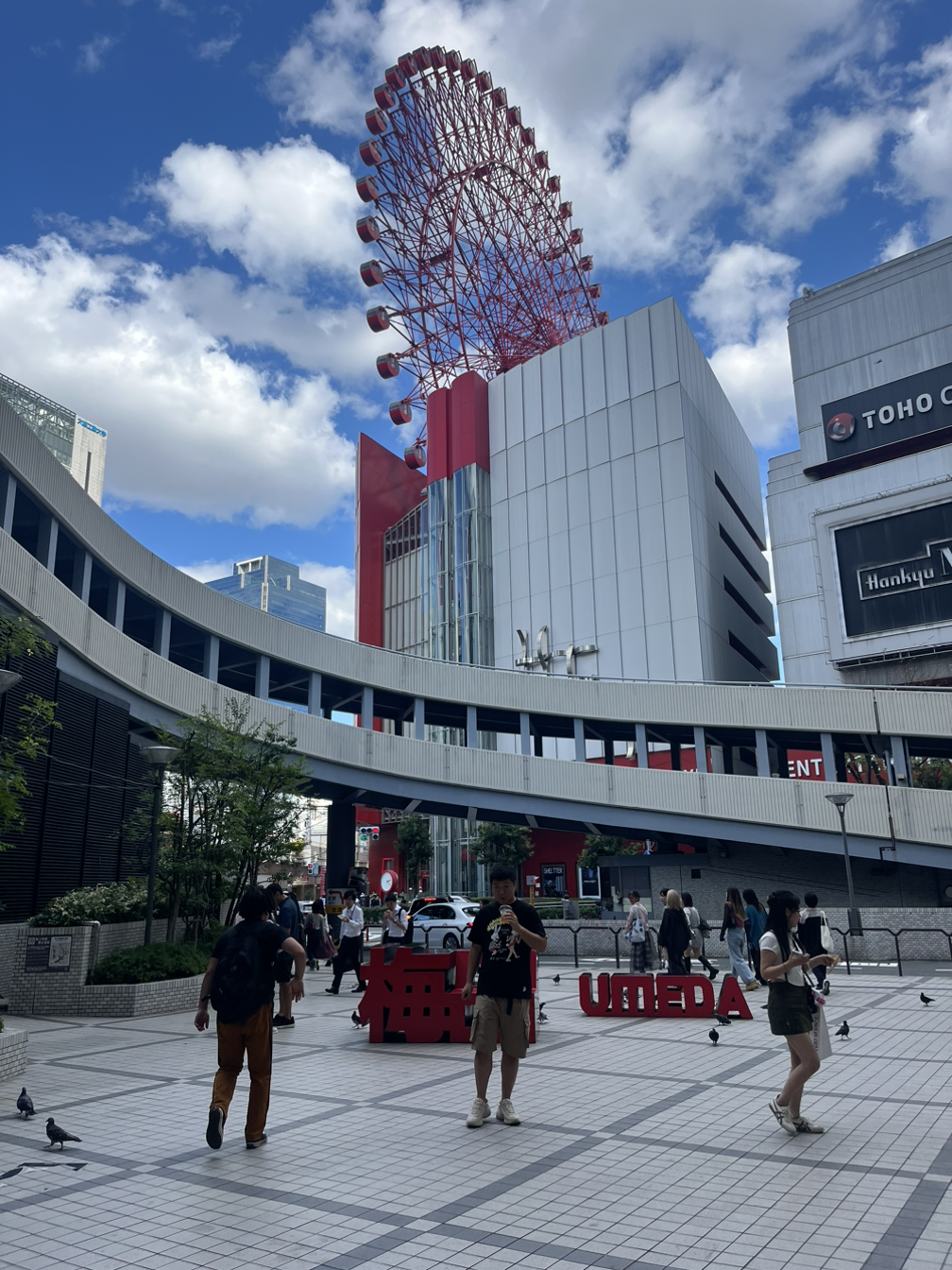 호텔이 우메다역 출구에서 가까워서 열심히 우메다역 출구를 찾아 나왔는데 예상치 못한 곳으로 나와버렸다. 그런데 우메다 랜드마크 장소였다. 하늘이 너무 맑고 예뻐서 사진을 찍지 않을 수가 없었다. 이때 뒤에 보이는 대관람차를 보고 타고 싶다고 했더니 아이는 오늘 엄마가 가고 싶어 했던 문방구에 못 갔으니, 대관람자는 꼭 타자고 했다. 나는 저녁에 야경을 보면서 타고 싶다고 했고 아이와 남편은 흔쾌히 그러자고 했다.