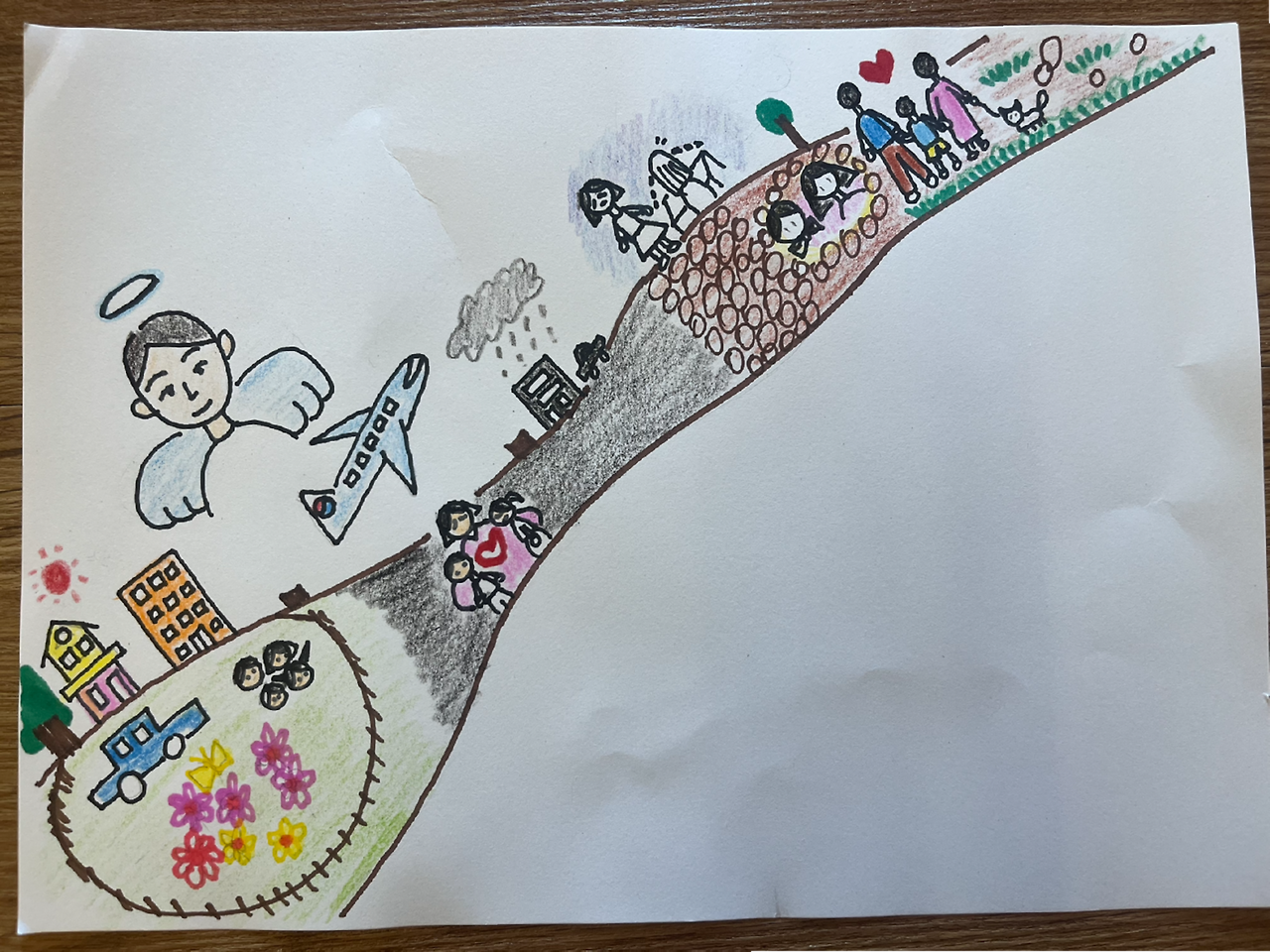 마지막 활동으로는 자신이 걸어온 인생길에 대해서 그림으로 표현하는 시간이 되었다. 비록 뚜렷하게 생각나진 않지만 알록달록하고 행복했던 느낌이 많다. 울타리도 넓고 든든하게 쳐져있고 집만 한 큰 나무가 있어 든든하고 예쁜 세상에 살았다. 아빠가 천사가 되기 전까지. 아빠가 천사가 된 이후 나무는 밑동만 남기고 잘려 있다. 기댈 곳이 없었던 어린 시절을 그렇게 표현했다. 엄마와 오빠와 나는 비행기를 타고 유학을 갔다. 엄마의 가슴에 하트는 뻥 뚫린 하트가 그려져 있다. 남편의 부재를 힘들어하는 엄마의 마음을 상징한다. 길이 검은색인 이유는 아스팔트 탄탄대로가 아닌 우울했던 시절을 나타냈다. 유학에서 돌아와 여전히 밑동만 남은 나무와 작은 차와 먹구름이 끼고 매일 비가 내리는 우리 집이다. 암울했던 시기였다. 이후 나는 대학생이 되었고 사회생활을 하게 되었다. 암울하다기보다는 힘들었던 기억이 나서 돌밭으로 그렸다. 그러다 남편을 만나 결혼을 했지만 신혼 때 다른 집안에서 큰 두 남녀가 하나로 움직이려니 티격태격했던 순간들이 떠올라 여전히 돌밭으로 그렸다. 그렇게 십 년이 흘러 지금의 남편은 밑동이 잘린 나무 대신 아직은 작지만 든든한 나의 나무가 되어주고 있다. 지금은 아이를 키우며 지내는 모습을 셋이 같이 걸어가는 모습으로 그렸고 우리는 서로를 무척이나 사랑하기에 꽉 찬 하트를 그렸다. 잔디밭이지만 가끔 돌도 있는 길을 그렇게 걸어가고 있다.