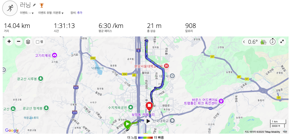 그래서 요즘은 매주 1km 정도씩 러닝 거리 늘리는 중이다. 이번 주에는 14km를 주파해 봤다.