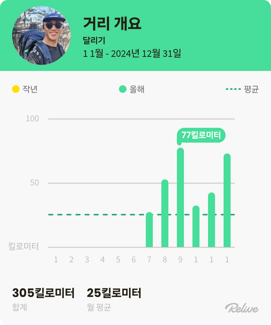 그래도 꾸준히 하려고 노력했다. 2024년을 relive 앱으로 돌아보니, 월평균 25k는 뛰었다.