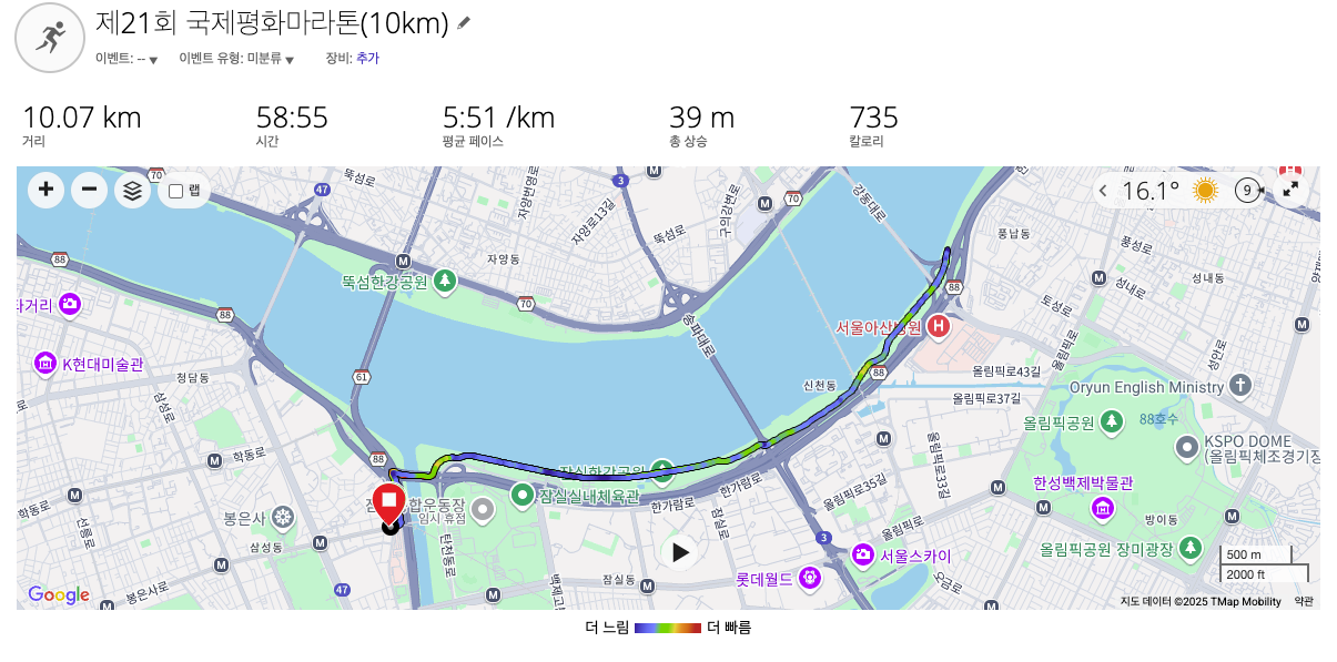 3개월 동안의 훈련으로 나름 많이 빨라졌다. 6분대 페이스가 되었고, 10km를 60분 이내로 주파했다.