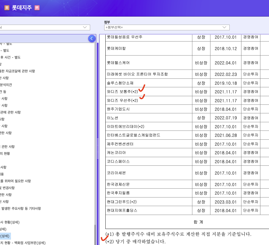 당장 롯데 지주의 매각으로 주주가 바뀌었을 텐데, 와디즈의 사업보고서에 이 내용은 자세히 설명되지 않는다. 보통 이 정도는 주석으로 설명을 달아 줄 법하다고 생각하는데, 변경된 주주명부만 있고, 전기 주주명부는 제외되어 있다. 롯데가 매각했다는 사실을 숨기려고 하는 것은 아닌가 하는 혼자만의 생각을 할 정도로 신기하게 느껴졌다. (아래 한국투자증권 주식회사 자리에 2023년 사업보고서에는 롯데 지주가 동일한 주식 수로 있었다.)