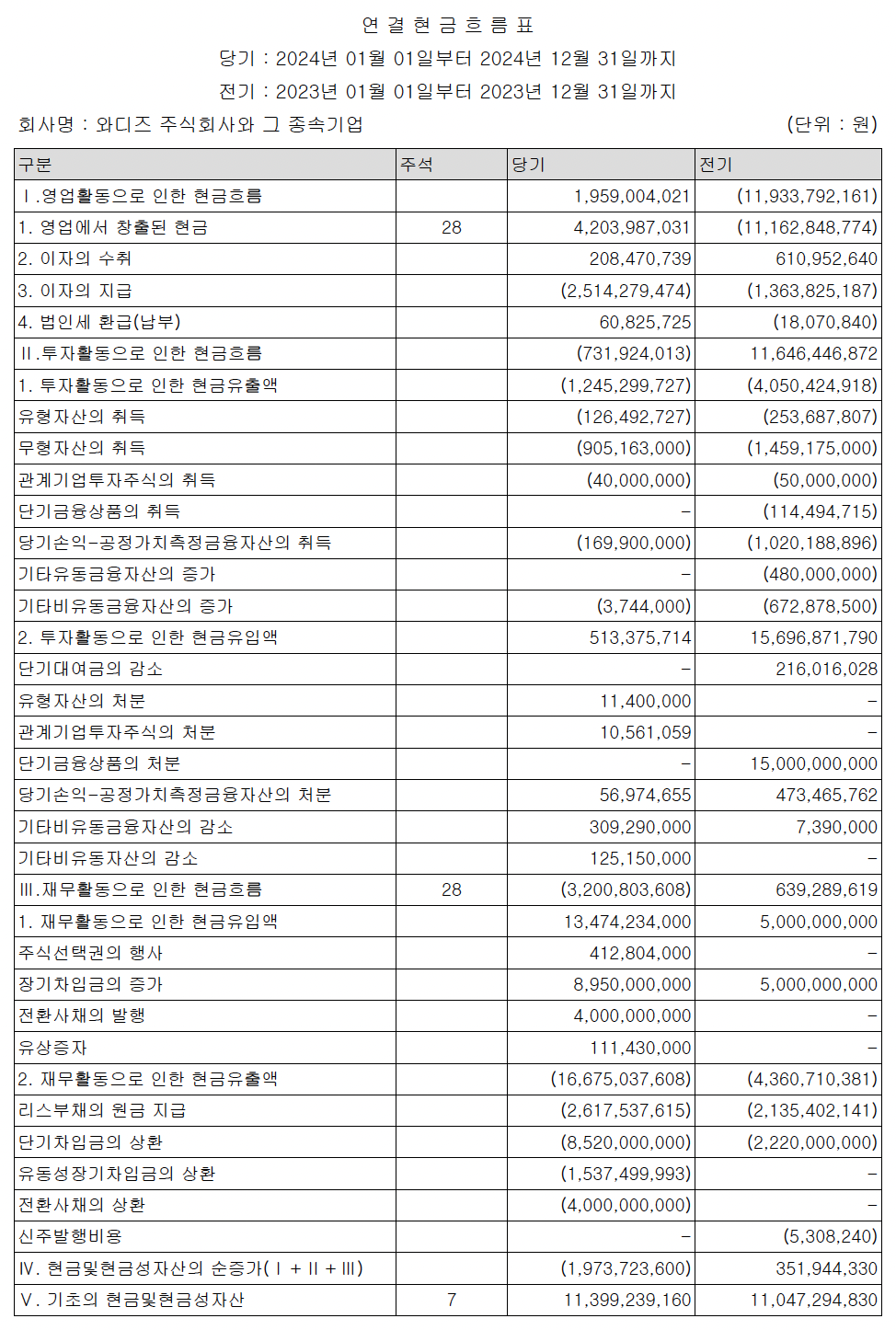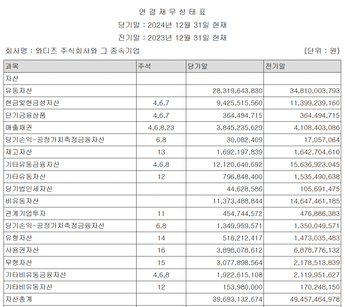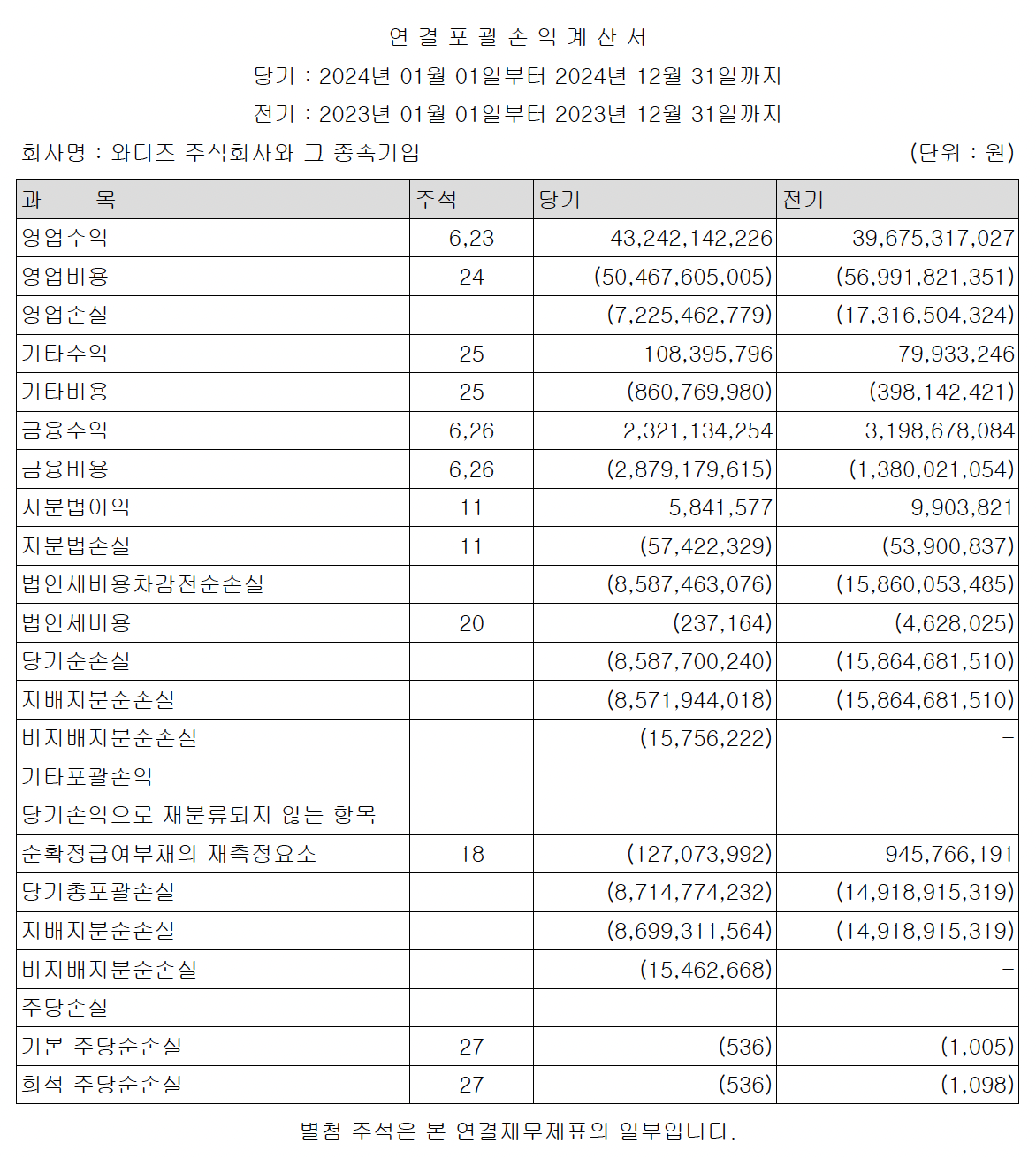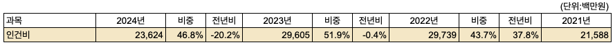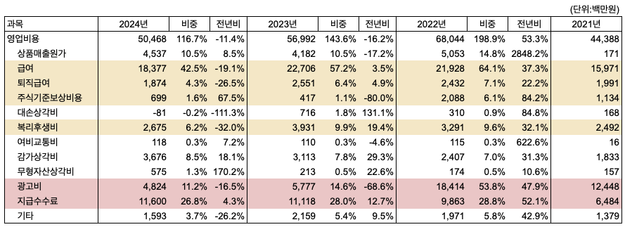 매출은 늘지 않았는데, 손실 규모는 2023년 158.6억 원에서 2024년 85.9억 원으로 줄었기에, 비용 절감에 엄청난 노력을 하지 않았을까 생각한다.