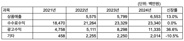전년 대비 영업수익은 9% 늘어났다. 그런데 놀랍게도 가장 중요한 수수료 수익은 작년과 변함이 없다. 와디즈 플랫폼에서 중개를 해주고 받는 수수료가 변함이 없다는 것은 거래금액에도 큰 변화가 없다는 말이다. 반면 광고수익은 83억에서 113억으로 늘었다. 입점 업체에게 광고비를 더 걷어서 수익을 늘렸다고 보면 된다.