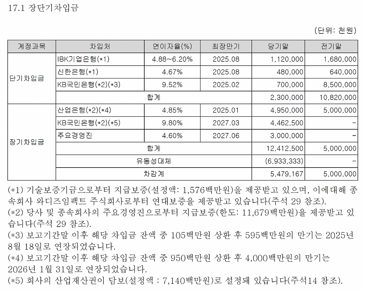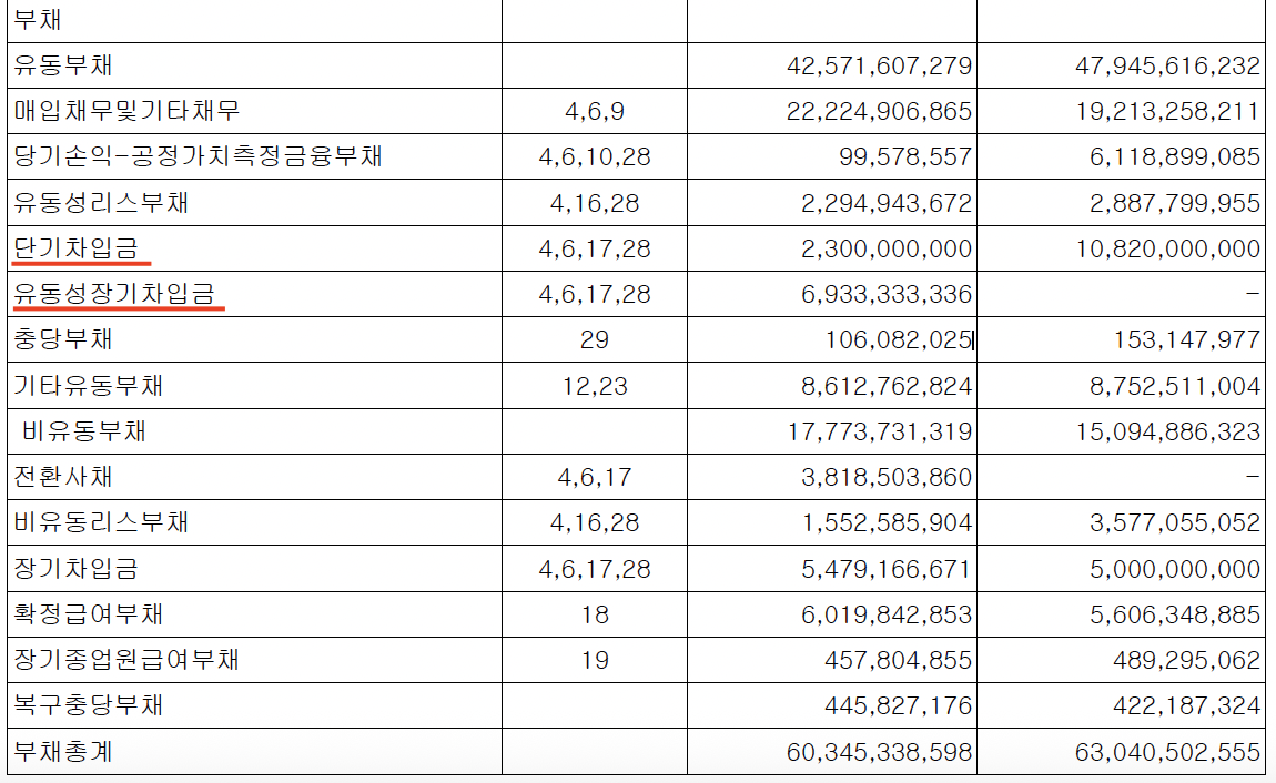 즉, 단기차입금이 108억에서 23억으로 줄었지만, 실질적으로는 여전히 단기차입금이 92억 원 수준인 상태이다. 유동부채(만기 1년 이내)는 전년 479억 대비 425억 원으로 줄었고, 비유동부채(만기 1년 초과)는 전년 151억 대비 177억 원으로 늘었다.