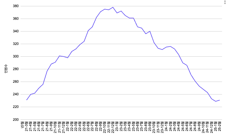 작년에 내가 글을 작성한 시기에 혁신의 숲 데이터 기준으로 316명이었는데, 지금은 231명으로 1년 만에 26.9%가 줄었다.
