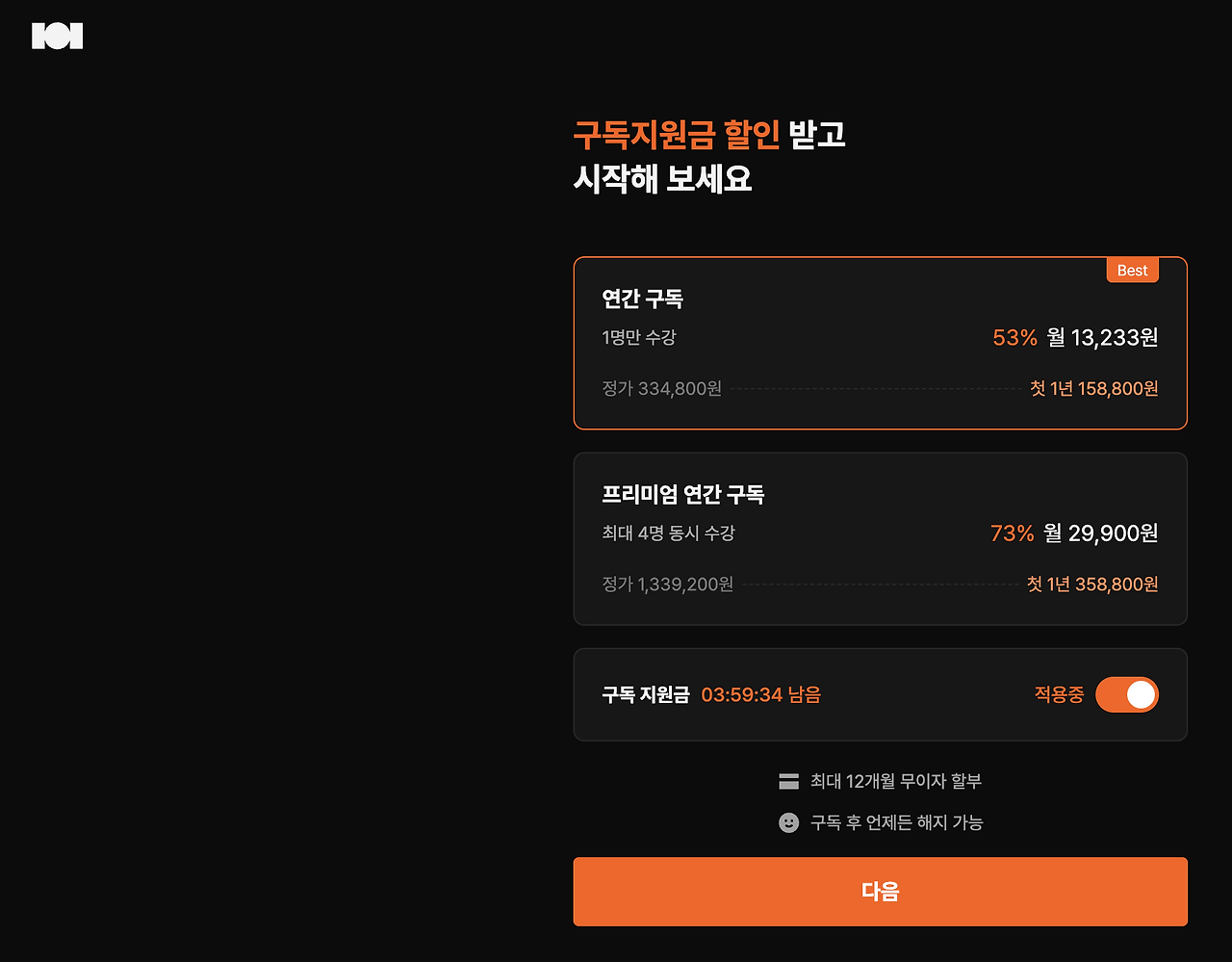 나도 오랜만에 클래스101에 들어가니, 연간 구독상품을 싸게 결제할 수 있는 기회를 제공해 주겠다고 했다.