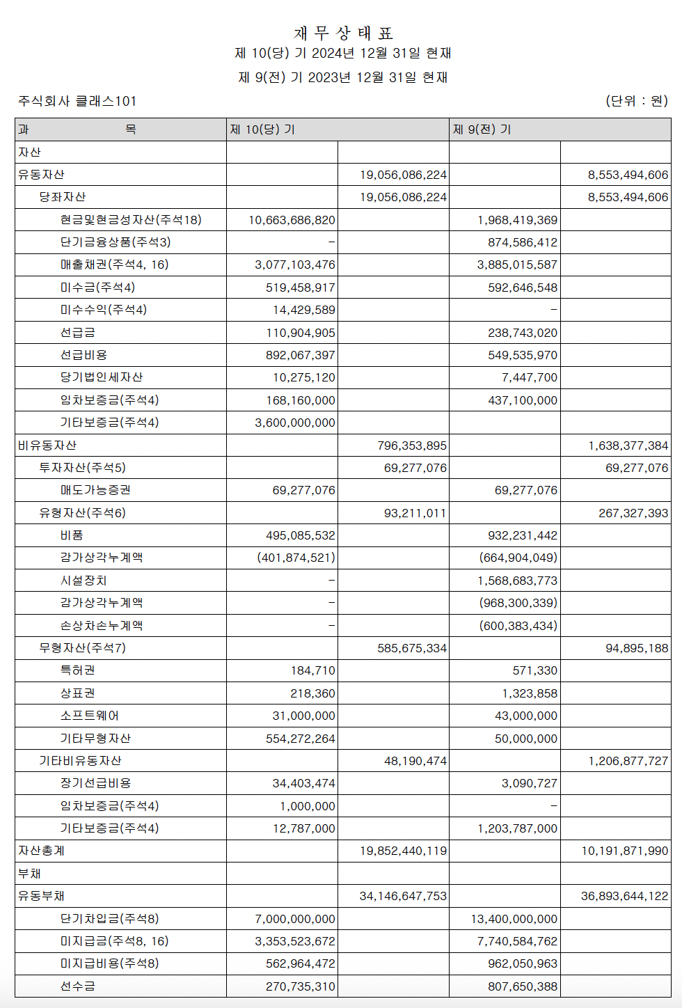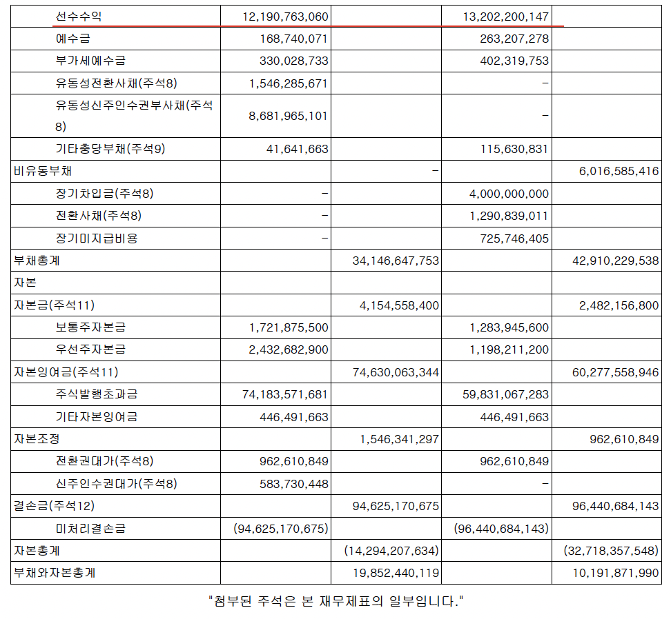 이렇게 연간 구독자의 결제를 받으면, 우선 선수수익으로 인식하고 매월 1개월치(12분의 1)만큼씩 매출로 인식한다. 그래서 재무상태표를 보면 부채 란에 선수수익이 있다. 2024년에 121.9억 원, 2023년에 132억 원이 선수수익으로 잡혀있다. 사실 선수수익은 미래의 매출이 되는 금액이기 때문에 2023년보다 2024년이 줄어들었다는 것은 좋은 시그널은 아니다.