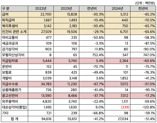 영업비용 전체로 2023년 대비 2024년이 286억 원이 줄었는데, 인력 관련 고정비(인건비, 임차료)가 163억 원으로 57%의 비중을 차지했다.