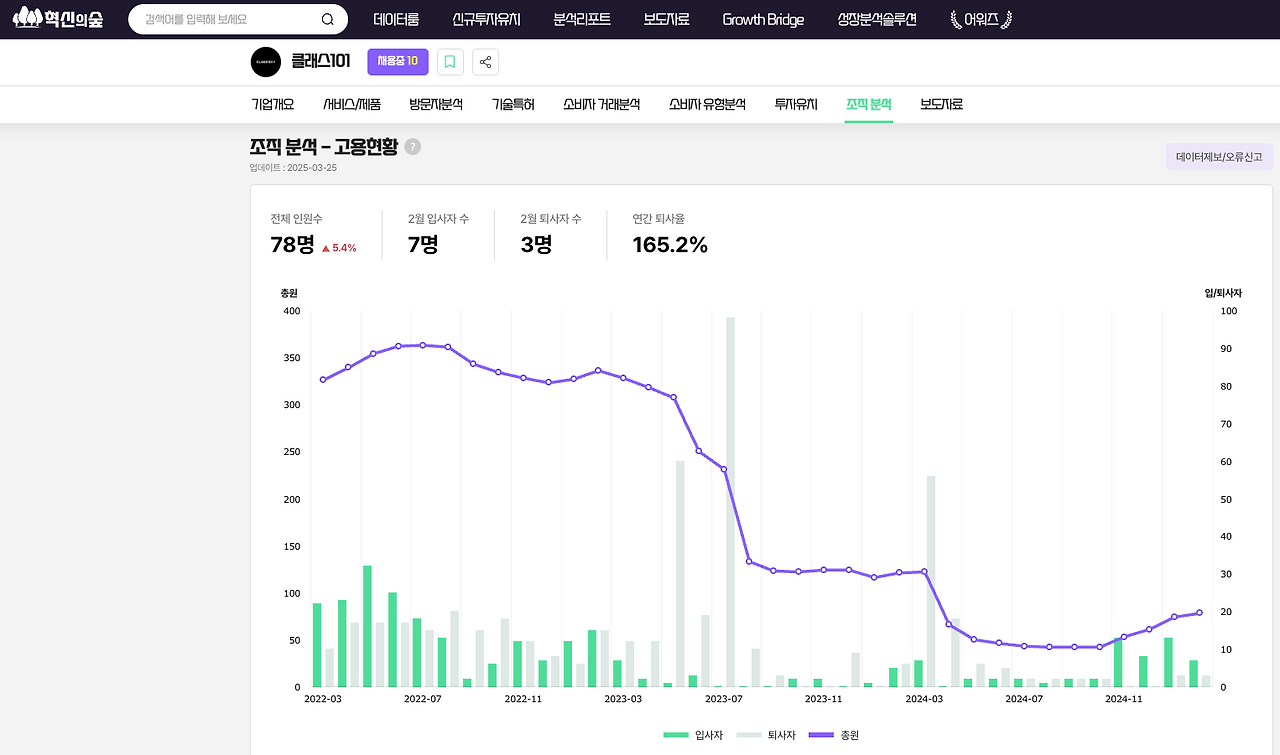 아래 표에서 회색 막대그래프가 퇴직자 수인데, 2~3번의 큰 인력 조정이 있었던 것으로 보인다. 23년 5월 60명, 23년 7월 98명, 24년 3월 56명의 퇴사자가 기록되어 있다.