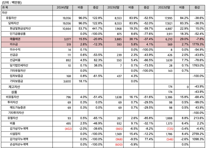 재무상태표의 자산 사이드에서 특이한 것이 있나 보았는데, 대부분 유동자산이어서 크게 들여다볼 것이 없었다. 다만 눈에 띄는 두 계정이 있었다. 매출채권과 미수금이다. 그냥 보면 비중이 그렇게 크거나 문제가 있어 보이진 않는다.