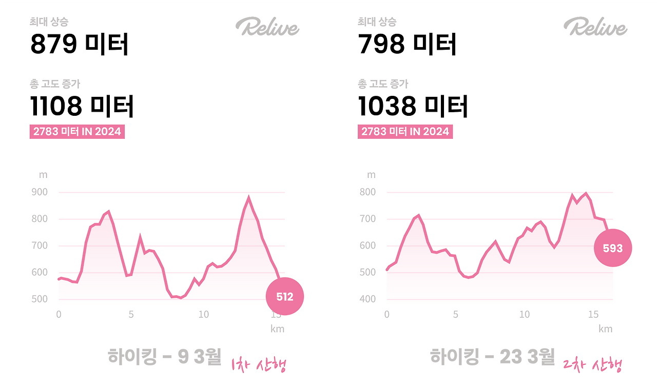 1차 산행(4구간), 2차 산행(5구간)을 객관적으로 비교하면 이번이 더 쉬웠다. 2주 전 1차 산행은 최고 879미터 고도였고, 이번 2차 산행은 최고 798미터의 고도를 올랐기 때문이다. 아래 표를 봐도 2주 전이 훨씬 더 고도 차이가 날카로웠던 것을 알 수 있다.