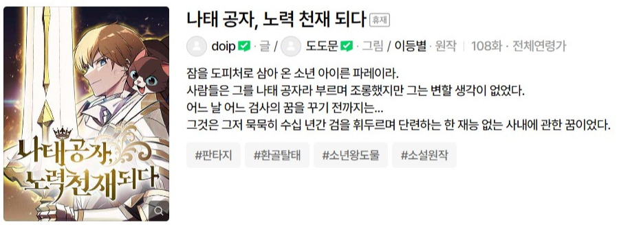 나름대로 괜찮은 취미생활이라 생각을 했기에 둥이들도 적당한 범위 내에서 즐길 수 있으면 좋겠다 싶었습니다. 그러던 어느 날 꽤 괜찮은 웹툰을 하나 발견했습니다. 게으르고 노력하지 않던 주인공이 깨달음을 얻어서 끊임없이 자신을 단련해서 위대한 사람이 되는 아주 간단한 형식의 시놉시스였죠. 아이들이 봐도 충분히 괜찮아 보였습니다.