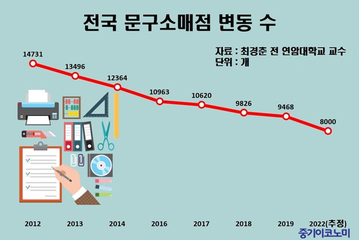 모든 물건을 택배로 시키는 문화가 코로나19 팬데믹 이후로 더욱 확산되었고 동네상점들은 물론이거니와 문구점 업계도 이런 변화에 직격탄을 맞았습니다. 통계에 따르면 2018년에 전국 문구소매점 수는 1만 개가 무너졌으며 매년 500곳 이상 폐업하고 있다고 합니다.