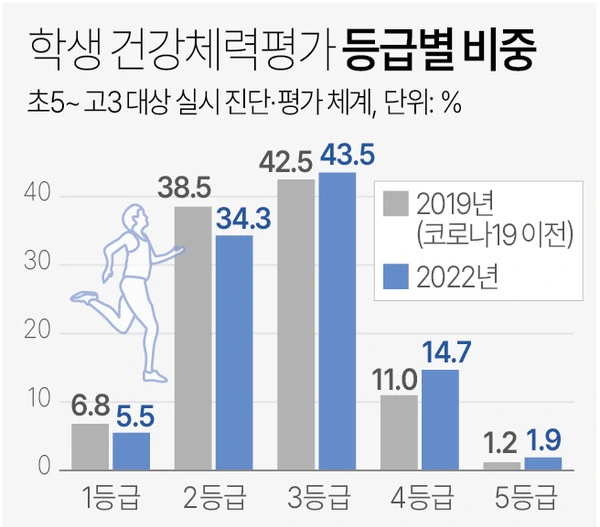 학생 건강체력평가, 일명 PAPS는 과거 '체력장'으로 불리던 학생 신체능력 검사를 대체해서 측정하고 평가하는 방식입니다. 2009년에 도입되어 초5부터 고3까지를 대상으로 매년 조사하고 있죠. 그 결과를 살펴보면 학생들의 평가등급이 나빠지고 있다는 사실을 알 수 있습니다.