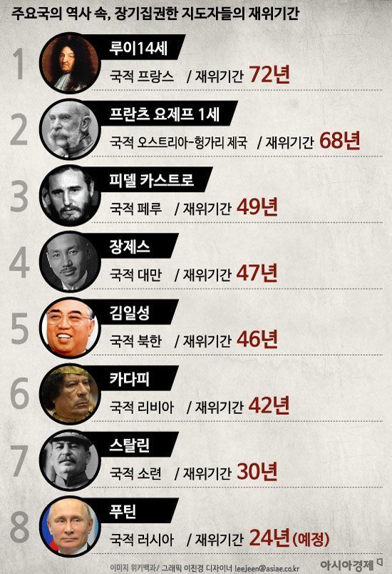 조선왕조는 27명의 왕이 통치를 했습니다. 그런데 600년 역사를 통틀어봐도 30년 이상 재위를 했던 왕은 단 일곱 명뿐이었다는 점을 감안했을 때 현대 사회에서의 30년 집권은 놀라울 수밖에 없습니다. 게다가 재선이 가능하다면 2036년까지도 대통령을 해 먹을 수 있습니다. 아프리카 일부 독재자들과 비교해도 전혀 뒤처지지 않습니다.