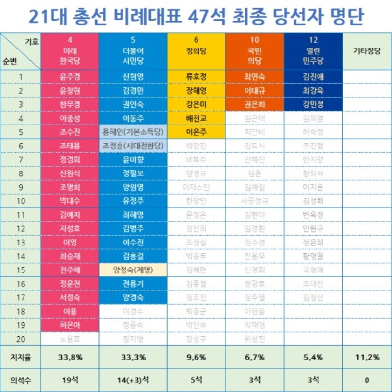 ㅇ 병립형 - 단순하게 비례대표의석 47석 만을 가지고 정당득표율로 환산하여 의석수 배분(거대 양당이 유리)