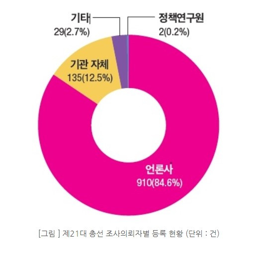 우리나라 정치 관련 여론조사는 방식이 꽤 엄격하며 의뢰자의 의뢰를 받아서 여론조사업체가 진행합니다. 보통 언론사에서 의뢰를 하는데 비용이 들어가다 보니 주요 지역에 대해서만 조사를 하는 편입니다. 선거 60일 이내에는 후보 당사자가 여론조사를 의뢰할 수 없기에 언론사에서 조사를 하지 않으면 유권자가 알 방법이 없습니다.