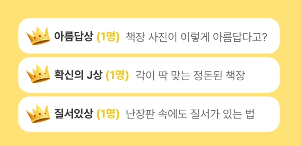 열심히 찾아봤는데 제가 보기에도 놀랄 만큼 잘 꾸며놓은 책장들이 몇 개 보였습니다. 제 경쟁자인 셈이죠. 이벤트의 규모에 비해서 선정되는 사람들은 세 명 밖에 없기에 딱히 기대를 하지는 않지만 오랜만에 사진을 깔끔하게 찍어놓았다는 사실만으로도 행복하고 의미 있는 시간이 아니었나 싶습니다.