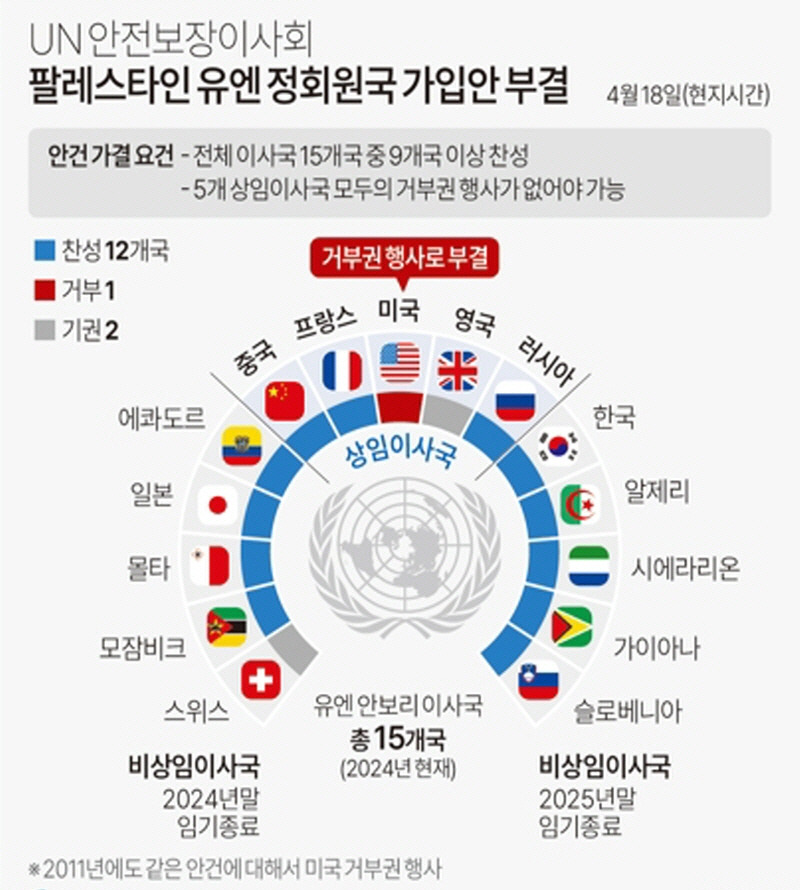 그래서 지금 세계적으로 일어나고 있는 전쟁과 분쟁에 유엔의 군사적 조치 결의는 당연히 이루어질 수가 없죠. 강대국끼리 서로 이해관계가 맞지 않는 경우가 많아서입니다. 이번에도 팔레스타인을 유엔에 가입시키는 안건에 대한 안보리 표결이 있었습니다. 투표결과 이번에는 미국이 이스라엘과의 관계를 의식해 반대를 했고 결국 부결되었다고 합니다.