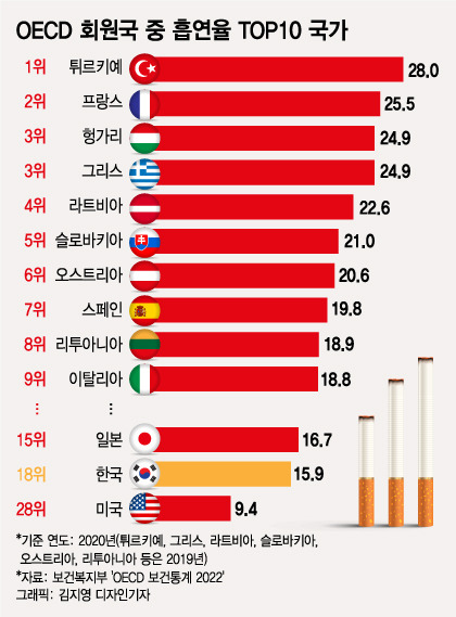많은 나라에서 파는 값을 올려서 흡연율을 줄이겠다는 정책을 펼치고 있지만 통계를 보면 그 전략이 완벽한 인과관계가 있어 보이지는 않습니다. 특히 프랑스 같은 경우 값이 비쌈에도 흡연율은 2위니까요. 우리나라도 아직 담뱃값이 올랐다고 하나 그에 따라 흡연율이 낮아졌다고 보기는 어렵습니다.