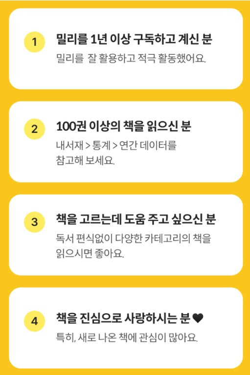 제가 과연 경쟁력이 있는 신청자인지 궁금했습니다. 작년 독서실적은 총 104권입니다. 하지만 밀리의 서재 이용 실적 기준으로 봤을 때는 백 권에 미치지 못했습니다. 플랫폼 이용 기준으로 본다면 저는 북마스터 합격기준에 미달된 지원자였던 셈이기에 신청할 때부터 크게 기대를 하지 않았죠.