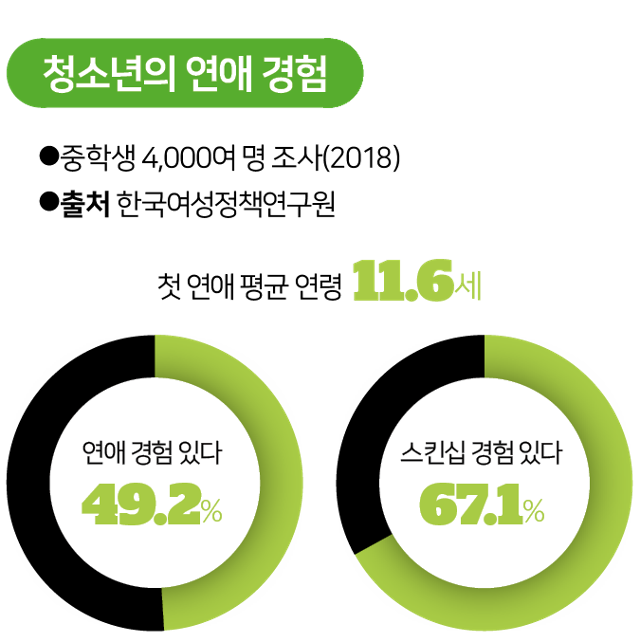 게다가 주위에서 하나둘씩 공개적으로 이성교제를 한다는 이야기를 듣고 나만 모태솔로일까 싶어 더 조바심이 나는 친구들도 있으리라 생각합니다. 이런 시기의 청소년에게 유행에 뒤처지는 일은 용납하기 쉽지 않으니까요. 통계를 어렵게 찾아보니 2018년 조사라서 시의성이 부족하기는 하지만 이성교제 비율이 확실히 높기는 합니다.