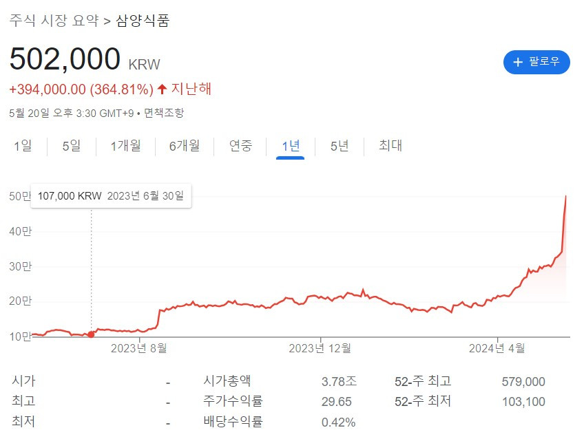 불닭볶음면 제조사인 삼양식품의 질주도 무섭습니다. 주식에 관심이 크게 없어서 몰랐는데 개인투자를 하는 지인들 말로는 요즘 무서울 정도로 상승하고 있는 종목이라고 하더군요. 외국에서 이렇게 입소문을 타는 제품이니 회사 실적에 대한 기대치가 더 올라가지 않았을까 생각됩니다.