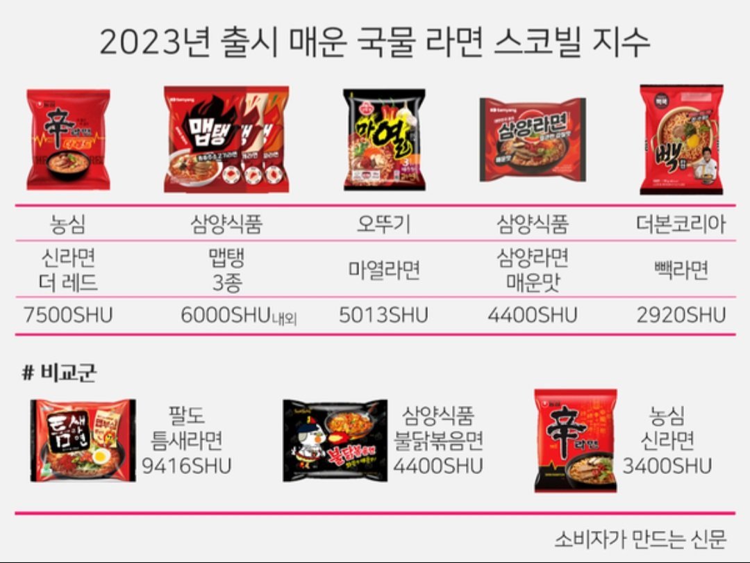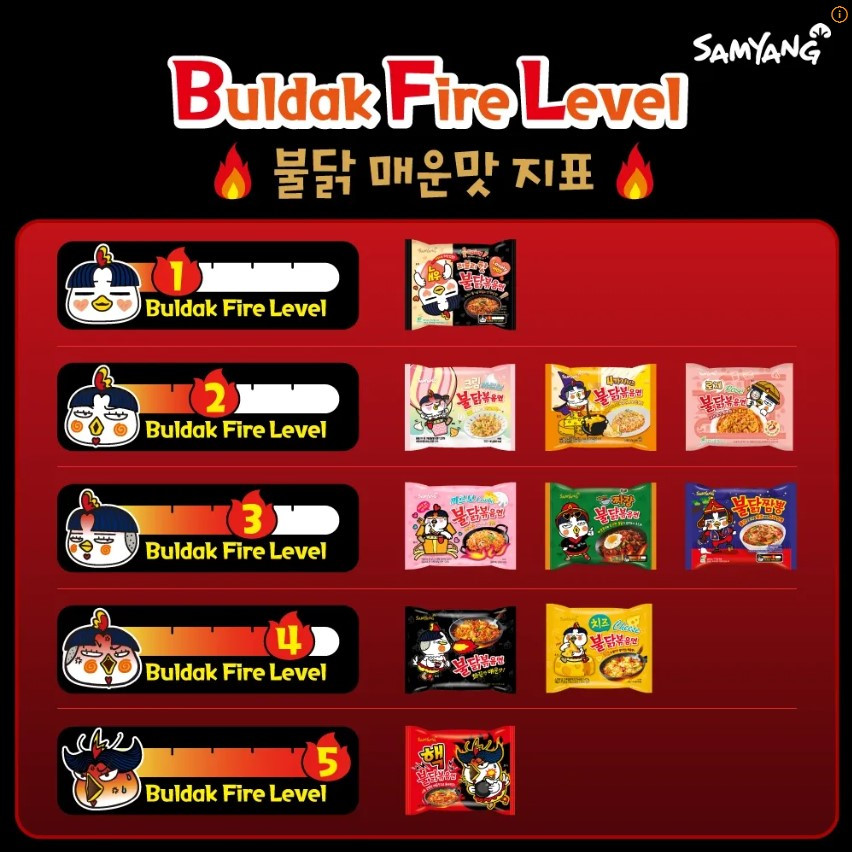 하지만 제가 유심히 보는 부분은 또 한 가지 있습니다. 바로 제품마다 맵기 단계를 표시해 준 아이디어였는데요. 보통 우리는 매운맛을 스코빌 지수로 표현하지만 실생활에서 음식을 살 때 이 수치를 직접 확인할 수 있는 방법이 많지는 않습니다. 라면 같은 경우도 따로 검색을 해야 알 수 있으니까요.