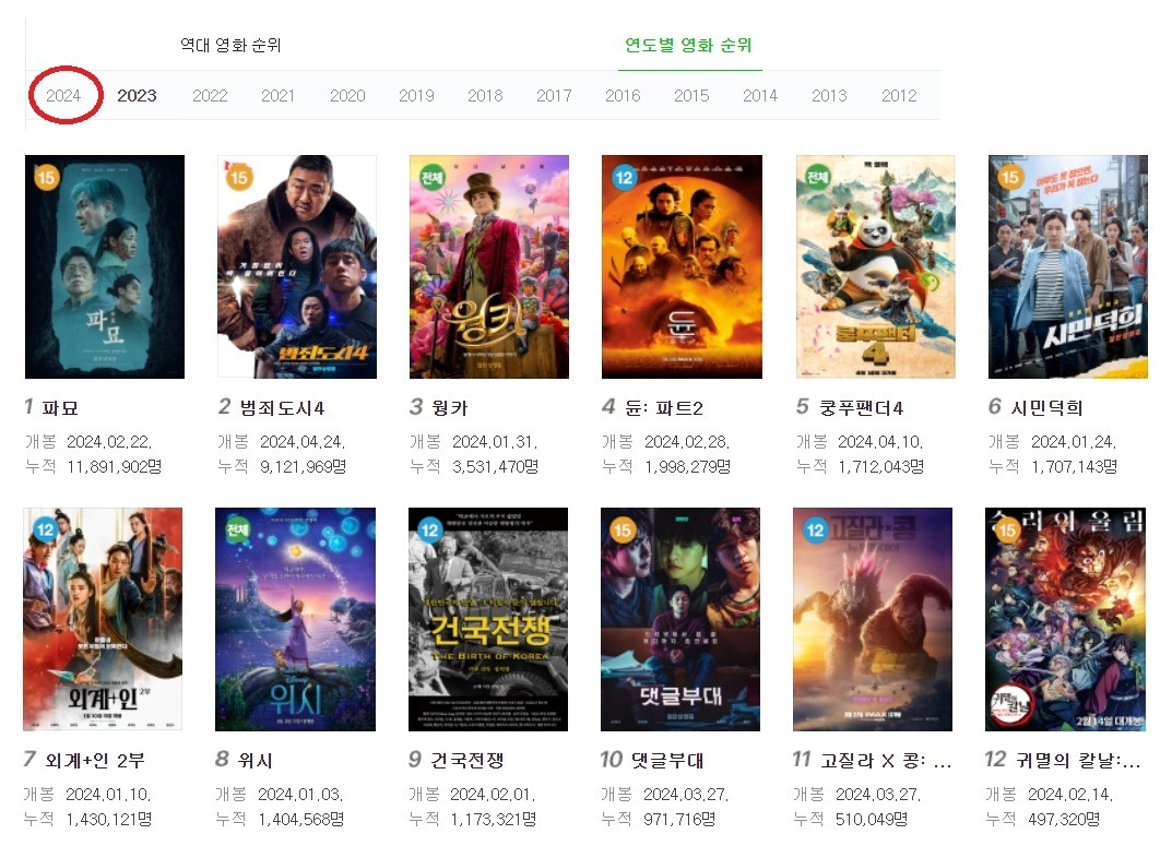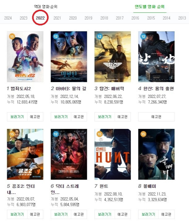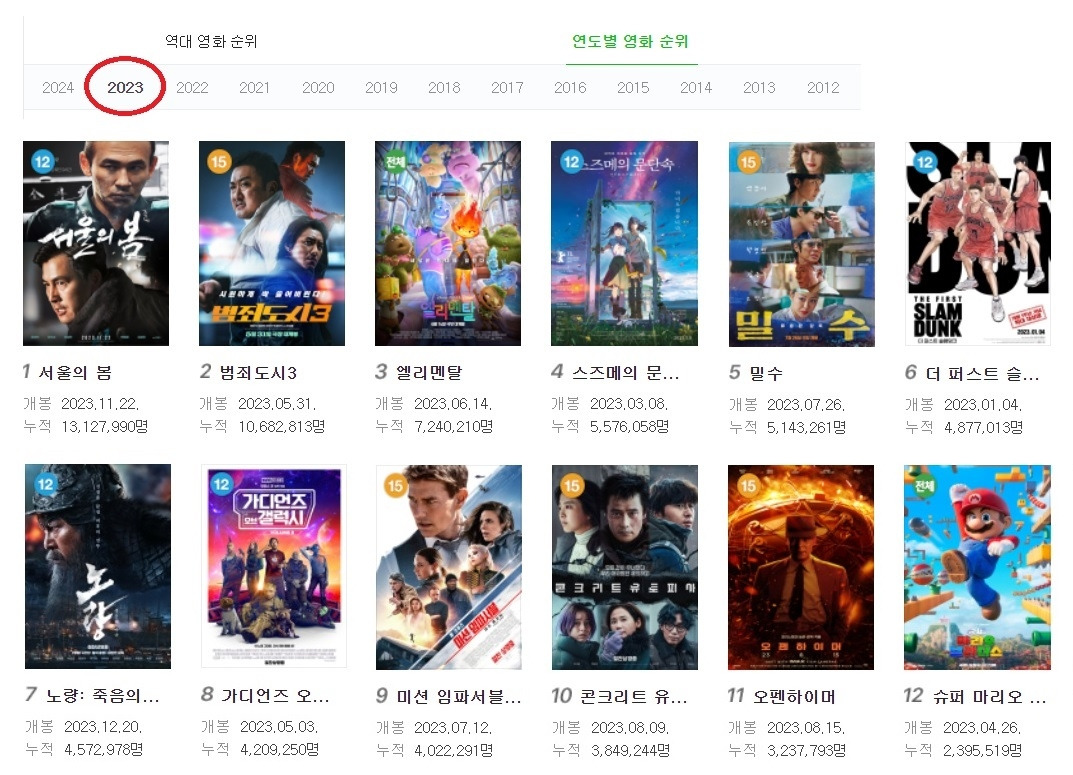 문제는 코로나가 약해지고 집합금지가 완화되기 시작한 2022년 이후에도 극장을 찾는 사람들이 많이 줄어들었다는 점입니다. 엔데믹이 선언된 2023년에도 극장가의 형편은 크게 다르지 않았죠. 범죄도시 시리즈를 제외하고는 전멸에 가까운 성적이라고 해도 과언이 아닙니다.