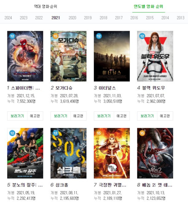 코로나19로 직격탄을 맞은 영화업계는 2020년부터 본격적인 고통의 나날을 보내왔습니다. 2019년에 5개의 천만 영화가 생긴 데 반해 집합금지 명령이 내려진 이후에는 극심한 불황이 이어졌습니다.