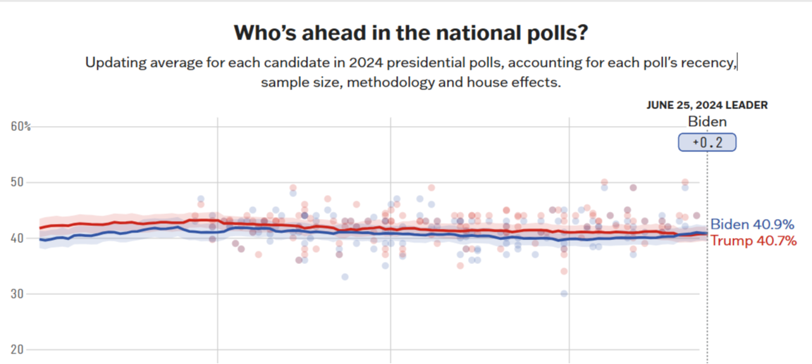 TV 토론 결과 분위기는 바이든의 참패처럼 보입니다. 토론 직후 조사한 여론조사에서는 바이든의 지지율이 2%나 하락했죠. 면접이나 토론, 발표를 할 때는 말하는 사람에게 느껴지는 에너지가 주는 영향이 큽니다. 대선후보라면 더욱 그렇겠죠.
