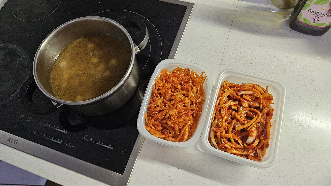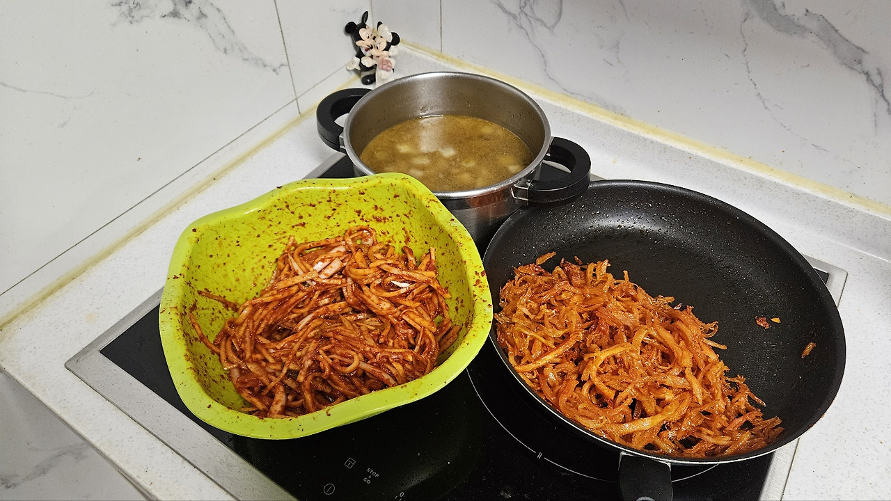 그래서 두 번째 요리인 무생채를 만들면서 또 세 번째 요리인 진미채무침까지 시작하게 됩니다.
