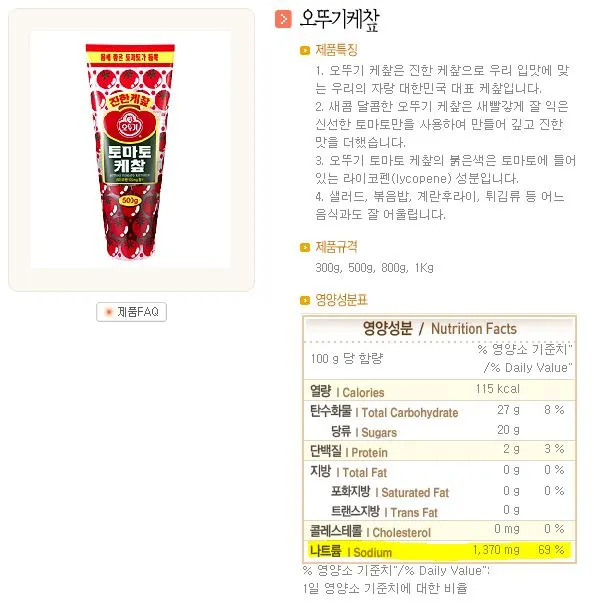하지만 찬찬히 살펴보니 그렇지도 않았습니다. 케첩을 비롯한 냉장고 속의 소스에 기재된 영양성분표를 살펴보니 생각보다 많은 나트륨이 포함되어 있다는 것을 알게 된 것이죠.